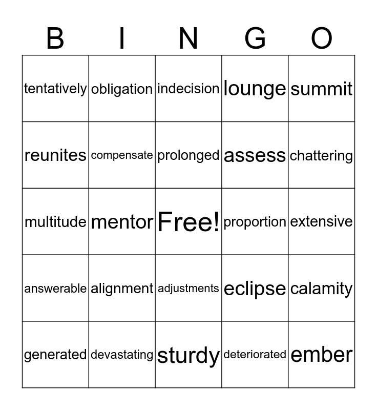 This bingo card has a free space and 24 words: alignment, devastating, prolonged, generated, summit, tentatively, reunites, obligation, proportion, adjustments, assess, multitude, eclipse, calamity, compensate, deteriorated, extensive, indecision, chattering, mentor, ember, answerable, lounge and sturdy.