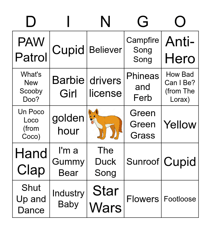 This bingo card has a free space and 32 words: Flowers, Spongebob Squarepants, golden hour, Dynamite, Hand Clap, Barbie Girl, Anti-Hero, Cupid, Cupid, Cruel Summer, drivers license, Believer, I Want It That Way, Baby, Green Green Grass, Peaches (from Mario), Shut Up and Dance, Un Poco Loco (from Coco), The Duck Song, I'm a Gummy Bear, Sunroof, Heat Waves, Yellow, Industry Baby, Footloose, Campfire Song Song, Phineas and Ferb, What's New Scooby Doo?, PAW Patrol, Star Wars, All Star and How Bad Can I Be? (from The Lorax).