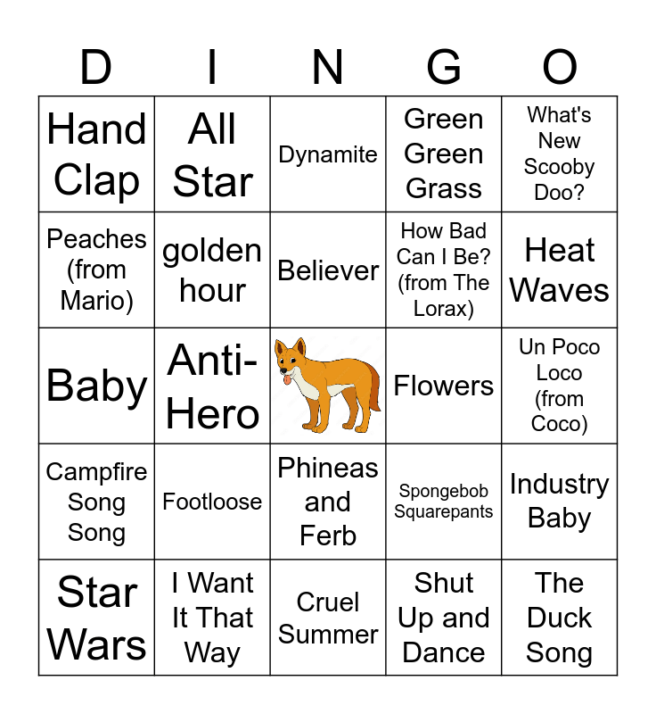 This bingo card has a free space and 31 words: Cruel Summer, Cupid, Anti-Hero, Barbie Girl, Hand Clap, Dynamite, golden hour, Spongebob Squarepants, Flowers, Shut Up and Dance, Un Poco Loco (from Coco), The Duck Song, I'm a Gummy Bear, Sunroof, Heat Waves, Yellow, Industry Baby, Footloose, Campfire Song Song, Phineas and Ferb, What's New Scooby Doo?, PAW Patrol, Star Wars, All Star, How Bad Can I Be? (from The Lorax), Peaches (from Mario), Green Green Grass, Baby, I Want It That Way, Believer and drivers license.