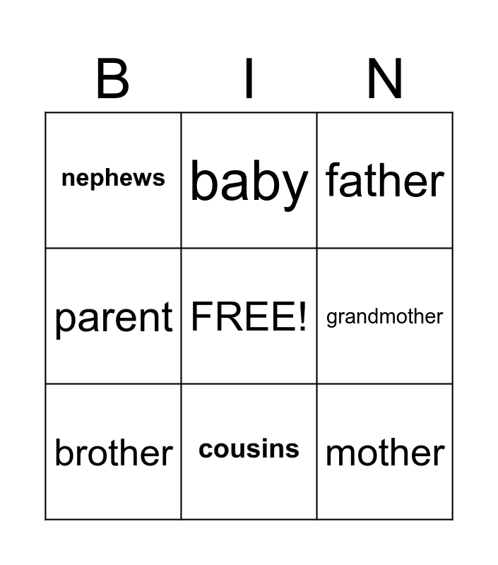 This bingo card has 2 images, a free space and 6 words: grandmother, father, baby, brother, mother and parent.