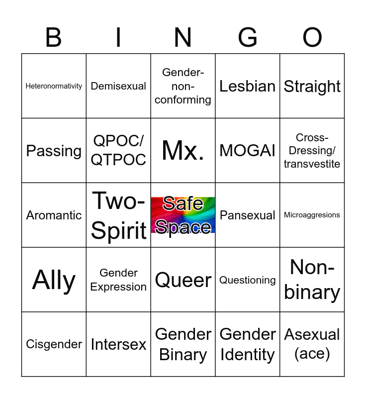 This bingo card has a free space and 43 words: Androgynonus, Asexual (ace), Bisexual, Cisgender, Gay, Gender Identity, Gender-non-conforming, Gender Role, Straight, Intersex, Lesbian, Pansexual, Queer, Gender Expression, Trans-gender, Gender Binary, Misgendering, Aromantic, Bigender, Cross-Dressing/ transvestite, Demisexual, Drag Queen/ King, Gender Fluid/ Gender Queer, Heteronormativity, Latinx, Microaggresions, Omnigender, Polyamory, Questioning, Ally, Agender, Non-binary, Biological Sex, Two-Spirit, FtM MtF, Closeted, Sexual Orientation, Mx., Passing, MOGAI, Bear/ Ursula Community, QPOC/ QTPOC and Gender Dysphoria.