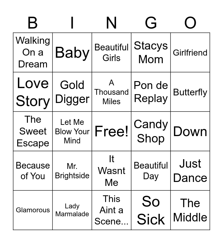 This bingo card has a free space and 24 words: Mr. Brightside, Lady Marmalade, A Thousand Miles, Glamorous, Girlfriend, Walking On a Dream, Love Story, Baby, Candy Shop, It Wasnt Me, Pon de Replay, The Sweet Escape, Beautiful Day, Just Dance, Gold Digger, So Sick, Down, Beautiful Girls, Butterfly, Let Me Blow Your Mind, The Middle, Because of You, Stacys Mom and This Aint a Scene....