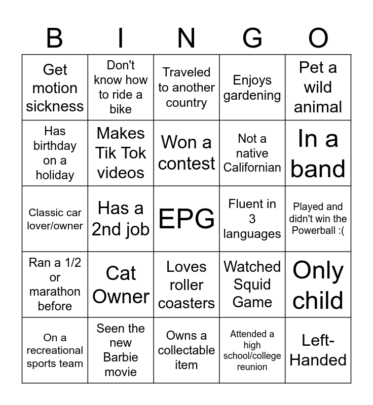 This bingo card has a free space and 24 words: Cat Owner, Seen the new Barbie movie, Won a contest, On a recreational sports team, Pet a wild animal, Get motion sickness, Has birthday on a holiday, Don't know how to ride a bike, Fluent in 3 languages, Loves roller coasters, Not a native Californian, Classic car lover/owner, Watched Squid Game, Only child, Makes Tik Tok videos, Attended a high school/college reunion, Played and didn't win the Powerball :(, Traveled to another country, In a band, Has a 2nd job, Left-Handed, Ran a 1/2 or marathon before, Enjoys gardening and Owns a collectable item.