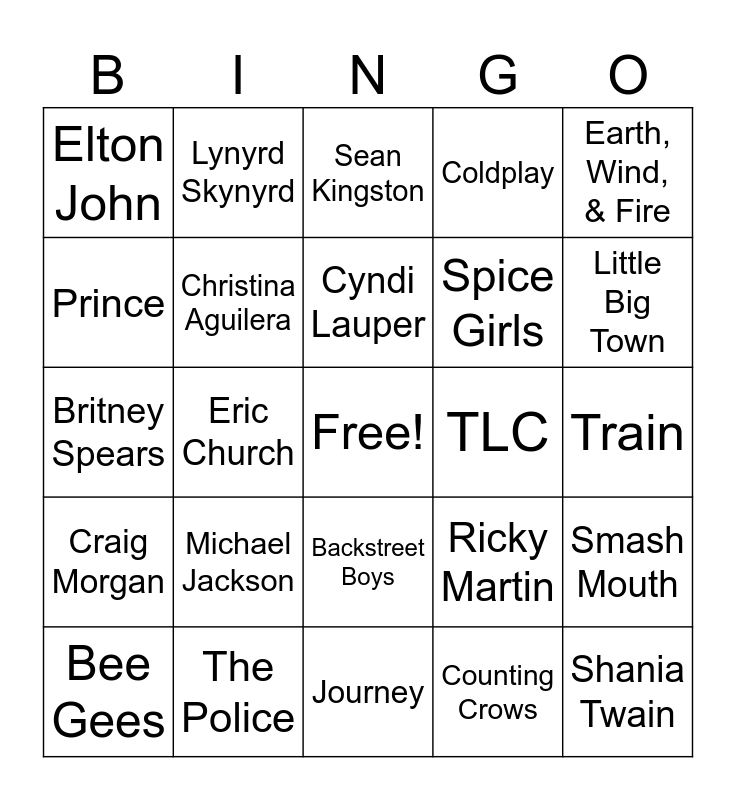 This bingo card has a free space and 24 words: Michael Jackson, The Police, Cyndi Lauper, Bee Gees, Earth, Wind, & Fire, Elton John, Prince, Lynyrd Skynyrd, TLC, Backstreet Boys, Spice Girls, Britney Spears, Ricky Martin, Smash Mouth, Christina Aguilera, Counting Crows, Train, Sean Kingston, Little Big Town, Eric Church, Shania Twain, Craig Morgan, Coldplay and Journey.