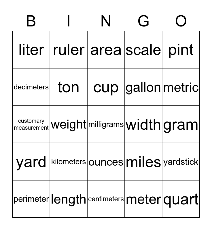 This bingo card has a free space and 29 words: perimeter, capacity, weight, milliliters, liter, area, ton, kilometers, width, length, gram, quart, centimeters, meter, metric, feet, ounces, yard, pint, customary measurement, miles, pounds, gallon, decimeters, scale, ruler, yardstick, cup and teaspoon.