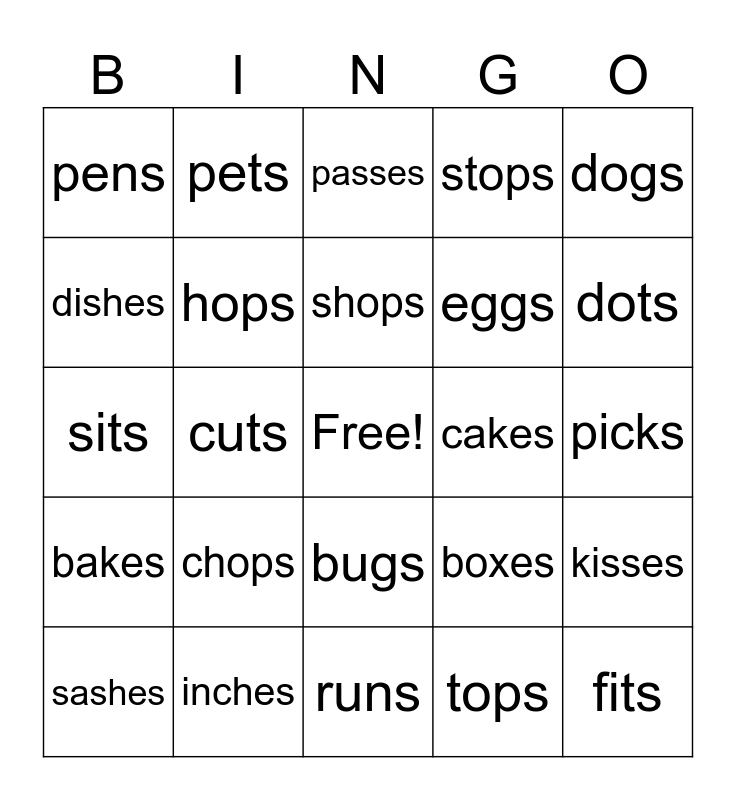 This bingo card has a free space and 24 words: chops, inches, shops, sashes, dogs, pens, dishes, pets, cakes, bugs, eggs, sits, boxes, kisses, hops, tops, picks, passes, dots, cuts, fits, bakes, stops and runs.