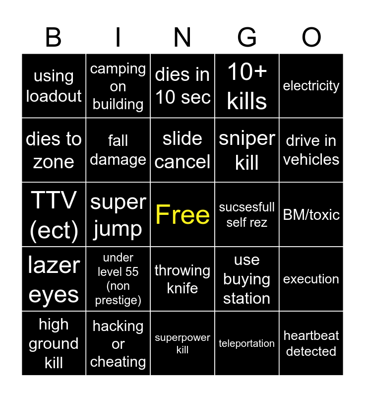 This bingo card has a free space and 24 words: high ground kill, under level 55 (non prestige), slide cancel, teleportation, electricity, using loadout, camping on building, dies in 10 sec, sucsesfull self rez, BM/toxic, TTV (ect), fall damage, use buying station, execution, dies to zone, hacking or cheating, superpower kill, 10+ kills, drive in vehicles, lazer eyes, super jump, throwing knife, sniper kill and heartbeat detected.