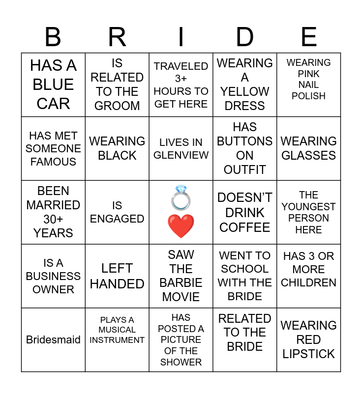 This bingo card has a free space and 29 words: Bridesmaid, HAS 2 PETS OR MORE, IS ENGAGED, WEARS A SIZE 8 SHOE, HAS A BLUE CAR, TRAVELED 3+ HOURS TO GET HERE, WEARING BLACK, LEFT HANDED, DOESN’T DRINK COFFEE, PLAYS A MUSICAL INSTRUMENT, THE YOUNGEST PERSON HERE, WEARING RED LIPSTICK, HAS POSTED A PICTURE OF THE SHOWER, RELATED TO THE BRIDE, WEARING GLASSES, CAN CHANGE A TIRE, SAW THE BARBIE MOVIE, IS A BUSINESS OWNER, WEARING PINK NAIL POLISH, BEEN MARRIED 30+ YEARS, WENT TO SCHOOL WITH THE BRIDE, IS SAME AGE AS BRIDE, HAS BUTTONS ON OUTFIT, HAS MET SOMEONE FAMOUS, WEARING A YELLOW DRESS, IS RELATED TO THE GROOM, HAS 3 OR MORE CHILDREN, LIVES IN GLENVIEW and LIVES DOWNTOWN.