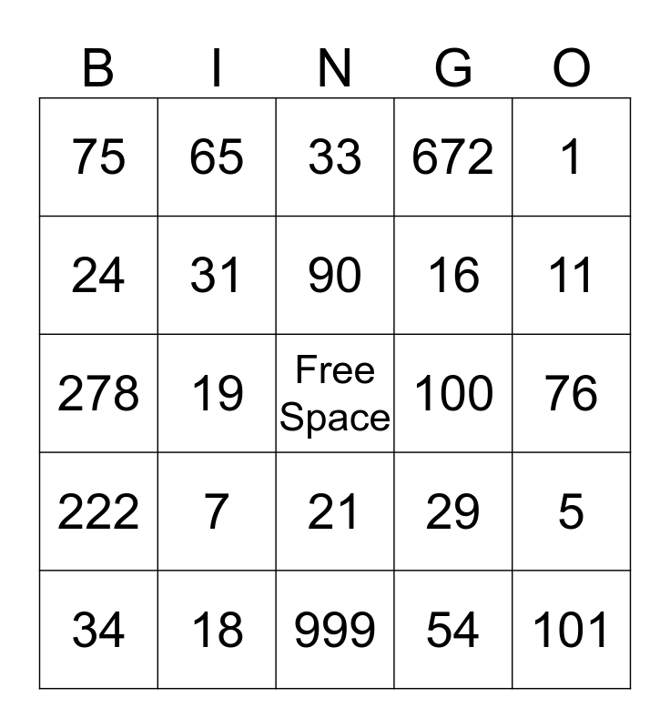 This bingo card has a free space and 24 words: 7, 18, 90, 34, 1, 75, 24, 65, 100, 21, 16, 278, 29, 5, 31, 54, 76, 33, 11, 19, 101, 222, 672 and 999.