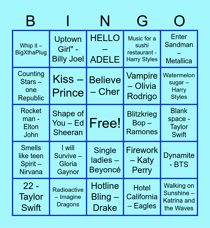 This bingo card has a free space and 99 words: Dancing Queen – ABBA, WATERLOO – ABBA, Back in black – AC/DC, HELLO – ADELE, Back to black - Amy Winehouse, 7 rings – Ariana Grande, Thank u, next - Ariana Grande, WAKE ME UP - AVICII, Rock lobster - the B-52, I want it that way – Backstreet boys, Titi me pregunto - Bad Bunny, Let it be – The Beatles, STAYIN' ALIVE - BEE GEES, Single ladies – Beyoncé, Crazy in Love (feat. Jay-Z) – Beyoncé, Whip it – BigXthaPlug, Uptown Girl" - Billy Joel, I gotta feeling – Black eyed peas, It’s my life – Bon Jovi, Livin’ on a prayer – Bon jovi, Baby One More Time- Britney Spears, Toxic -Britney spears, Glory Days – Bruce Springsteen, Treasure – Bruno Mars, Summer of ’69 – Bryan Adams, Dynamite - BTS, Believe – Cher, 2Girls Just Want to Have Fun - Cyndi Lauper, Say my name - Destiny's Child, Walk of Life – Dire Straits, Hotline Bling – Drake, Hotel California – Eagles, September - Earth, Wind & Fire, Bad Habits – Ed Sheeran, Shape of You – Ed Sheeran, Rocket man - Elton John, Sugar, we're goin down - Fall out Boy, Killing me softly with his song – Fugees, We are young – Fun, I will Survive – Gloria Gaynor, Welcome to the Jungle – Guns n’ Roses, Watermelon sugar – Harry Styles, Music for a sushi restaurant - Harry Styles, Radioactive – Imagine Dragons, Empire State of Mind – Jay-Z, All Along the Watchtower – Jimi Hendrix, Bad Reputation – Joan Jett, I love Rock ‘N roll – Joan Jett & the blackhearts, Don’t stop believing – journey, Rock Your Body – Justin Timberlake, Running up that Hill – Kate Bush, Walking on Sunshine – Katrina and the Waves, Firework – Katy Perry, Since U been gone – Kelly Clarkson, Mr. Brightside – The Killers, Rock and Roll all Nite – Kiss, Just Dance - Lady Gaga, Bad Romance - Lady Gaga, Old Town Road – Lil Nas X, Truth Hurts – Lizzo, Royals – Lorde, Despacitio – Luis fonsi & Daddy Yankee, Uptown Funk – Mark Ronson & Bruno Mars, Sugar – Maroon 5, All about that Bass – Meghan Trainor, Enter Sandman – Metallica, The way you make me feel – Michael Jackson, Wrecking Ball – Miley Cyrus, Party in the USA – Miley Cyrus, Smells like teen Spirit – Nirvana, Mo Money Mo Problems – Biggie, Vampire – Olivia Rodrigo, Counting Stars – one Republic, So What – P!nk, I write sins not tragedies - Panic! at the Disc, 1999 – Prince, Kiss – Prince, Gangnam style – PSY, Bohemian Rhapsody – Queen, We are the Champions – Queen, Blitzkrieg Bop – Ramones, Jessie’s Girl – Rick Springfield, Umbrella (feat Jay -Z) – Rihanna, We found love (feat Calvin Harris) – Rihanna, Hips Don't Lie - Shakira ft. Wyclef Jean, ALL STAR - SMASH MOUTH, I JUST CALLED TO SAY I LOVE YOU - STEVIE Wonder, Eye of the Tiger – Survivor, Blank space - Taylor Swift, 22 - Taylor Swift, Modern Day Cowboy – Tesla, No Scrubs – TLC, Africa – Toto, Hey, Soul Sister - Train, Bad Guy – Billie Eilish, HEY YA! – OUTKAST, Lose Yourself – Eminem, Blinding lights – The Weekend and I wanna Dance with Somebody – Whitney Houston.