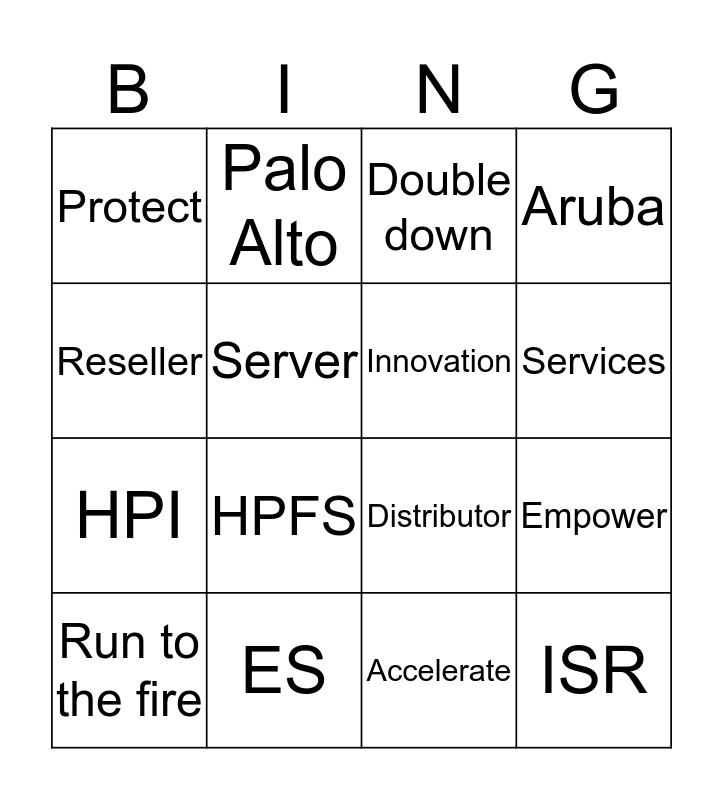 This bingo card has 30 words: Bias for action, Transformation, Empower, Enable, Protect, Double down, Innovation, Synergy, ES, Focus, Accelerate, Run to the fire, Collaborate, Partner, HPFS, TSS, TSC, ISR, EAM, Reseller, Distributor, Discover, Palo Alto, HPI, Server, Aruba, Wireless, Software, Services and UAT.