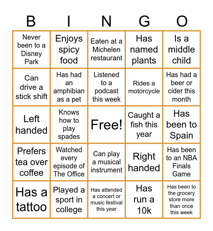 This bingo card has a free space and 24 words: Watched every episode of The Office, Played a sport in college, Listened to a podcast this week, Has a tattoo, Is a middle child, Never been to a Disney Park, Can drive a stick shift, Enjoys spicy food, Caught a fish this year, Can play a musical instrument, Rides a motorcycle, Left handed, Right handed, Has been to an NBA Finals Game, Has had an amphibian as a pet, Has run a 10k, Has been to Spain, Eaten at a Michelen restaurant, Has had a beer or cider this month, Knows how to play spades, Has been to the grocery store more than once this week, Prefers tea over coffee, Has named plants and Has attended a concert or music festival this year.