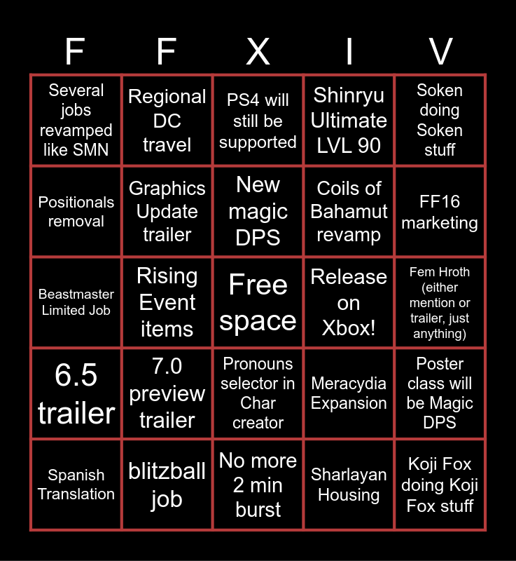 This bingo card has a free space and 24 words: 7.0 preview trailer, blitzball job, New magic DPS, Spanish Translation, Soken doing Soken stuff, Several jobs revamped like SMN, Positionals removal, Regional DC travel, Release on Xbox!, Pronouns selector in Char creator, Coils of Bahamut revamp, Beastmaster Limited Job, Meracydia Expansion, Poster class will be Magic DPS, Graphics Update trailer, Sharlayan Housing, Fem Hroth (either mention or trailer, just anything), PS4 will still be supported, FF16 marketing, Rising Event items, Koji Fox doing Koji Fox stuff, 6.5 trailer, Shinryu Ultimate LVL 90 and No more 2 min burst.
