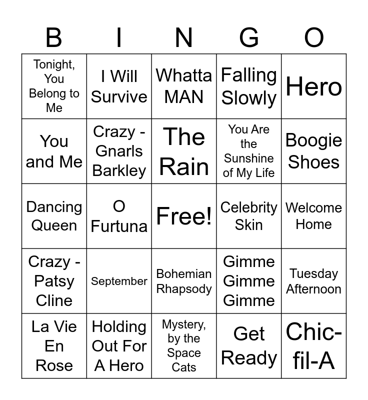 This bingo card has a free space and 33 words: Staying Alive, What's Up Danger?, O Furtuna, Rappers Delight, Crazy - Patsy Cline, Crazy - Gnarls Barkley, Hero, La Vie En Rose, I Will Survive, Gold Digger, The Rain, Whatta MAN, Sock It To Me, I Gotta Be Me, Celebrity Skin, Boogie Shoes, Holding Out For A Hero, Dancing Queen, September, Gimme Gimme Gimme, Bohemian Rhapsody, Dont Be Suspicious, Tonight, You Belong to Me, Welcome Home, Mystery, by the Space Cats, Chic-fil-A, Falling Slowly, You Are the Sunshine of My Life, You and Me, Tuesday Afternoon, American Pie, Get Ready and Holding Out for A Hero.