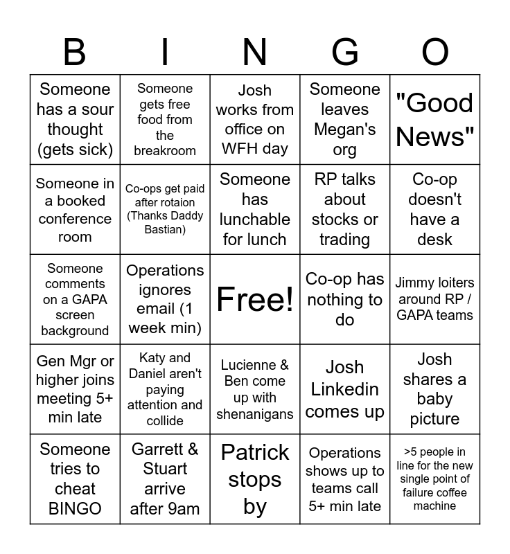 This bingo card has a free space and 25 words: Katy and Daniel aren't paying attention and collide, Patrick stops by, Someone has lunchable for lunch, Someone tries to cheat BINGO, "Good News", Someone has a sour thought (gets sick), Someone in a booked conference room, Someone gets free food from the breakroom, Co-op has nothing to do, Lucienne & Ben come up with shenanigans, RP talks about stocks or trading, Someone comments on a GAPA screen background, Josh Linkedin comes up, Josh shares a baby picture, Co-ops get paid after rotaion (Thanks Daddy Bastian), Carson misses free food/lunch in the breakroom, Jimmy loiters around RP / GAPA teams, Josh works from office on WFH day, Co-op doesn't have a desk, Operations ignores email (1 week min), >5 people in line for the new single point of failure coffee machine, Garrett & Stuart arrive after 9am, Gen Mgr or higher joins meeting 5+ min late, Someone leaves Megan's org and Operations shows up to teams call 5+ min late.
