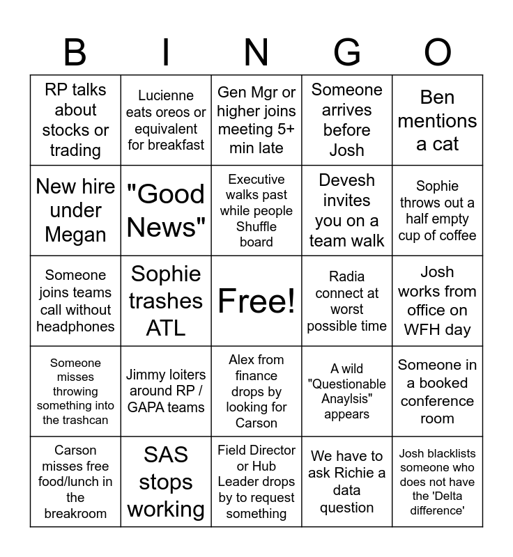 This bingo card has a free space and 25 words: Jimmy loiters around RP / GAPA teams, Field Director or Hub Leader drops by to request something, Executive walks past while people Shuffle board, Carson misses free food/lunch in the breakroom, Ben mentions a cat, RP talks about stocks or trading, New hire under Megan, Lucienne eats oreos or equivalent for breakfast, Radia connect at worst possible time, Alex from finance drops by looking for Carson, Devesh invites you on a team walk, Someone joins teams call without headphones, A wild "Questionable Anaylsis" appears, Someone in a booked conference room, "Good News", Josh gets excited about getting a Bingo answer, Josh works from office on WFH day, Gen Mgr or higher joins meeting 5+ min late, Sophie throws out a half empty cup of coffee, Sophie trashes ATL, Josh blacklists someone who does not have the 'Delta difference', SAS stops working, Someone misses throwing something into the trashcan, Someone arrives before Josh and We have to ask Richie a data question.