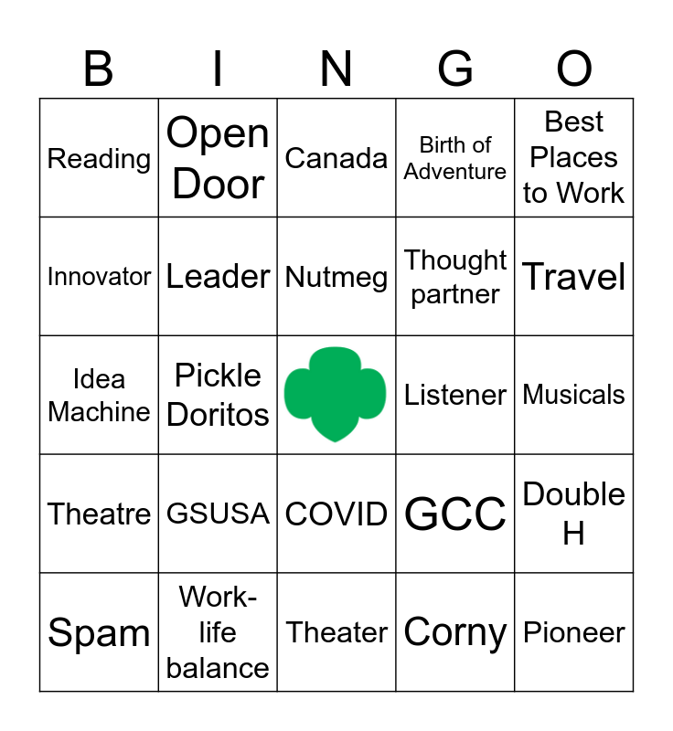 This bingo card has a free space and 26 words: COVID, Corny, Nutmeg, Work-life balance, Best Places to Work, Reading, Innovator, Open Door, Musicals, GCC, Thought partner, Idea Machine, Double H, Spam, Pickle Doritos, 4 day work week!, Birth of Adventure, Theatre, Canada, Pioneer, Travel, Theater, Listener, GSUSA, Leader and The cookies that shall not be named.