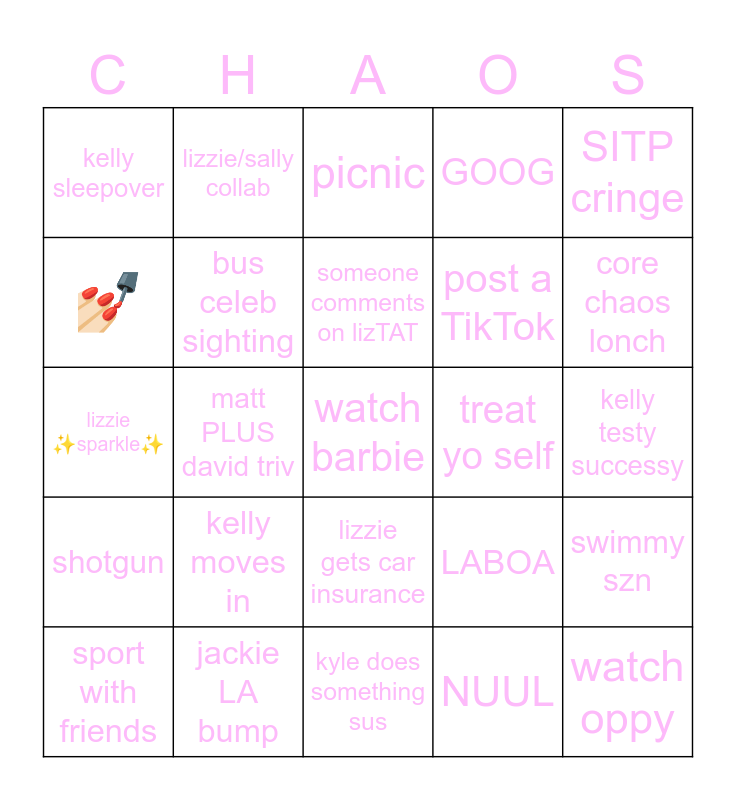 This bingo card has a free space and 24 words: kelly moves in, jackie LA bump, someone comments on lizTAT, sport with friends, SITP cringe, kelly sleepover, π π», lizzie/sally collab, treat yo self, lizzie gets car insurance, post a TikTok, lizzie β¨sparkleβ¨, LABOA, swimmy szn, bus celeb sighting, NUUL, kelly testy successy, picnic, core chaos lonch, matt PLUS david triv, watch oppy, shotgun, GOOG and kyle does something sus.