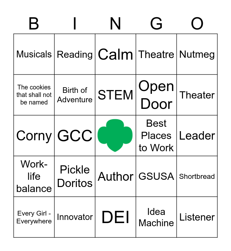 This bingo card has a free space and 36 words: CEO Patch, Ax Throwing, COVID, Birth of Adventure, GSUSA, Work-life balance, STEM, Pioneer, Nutmeg, 4 day work week!, GCC, Theatre, Thought partner, Best Places to Work, Theater, Musicals, Double H, Pickle Doritos, Listener, Calm, Leader, Shortbread, Innovator, Every Girl - Everywhere, DEI, Reading, Corny, Travel, Open Door, The cookies that shall not be named, Canada, Spam, Idea Machine, Author, Movie nights and Family.