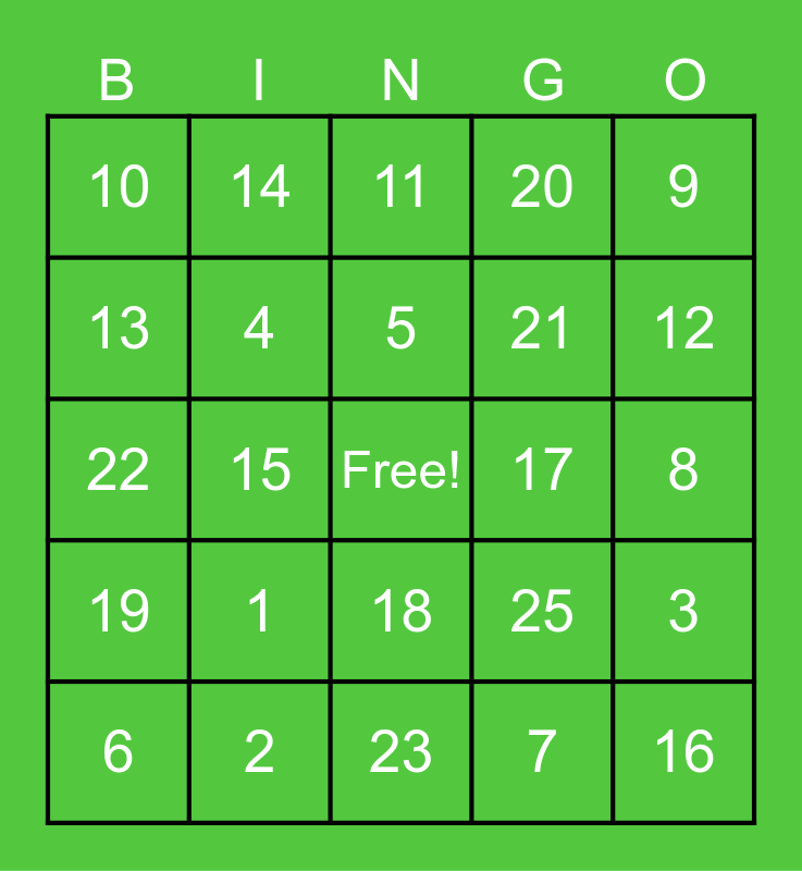 This bingo card has a free space and 24 words: 1, 2, 5, 6, 9, 10, 13, 14, 17, 18, 21, 22, 25, 3, 4, 7, 8, 11, 12, 15, 16, 19, 20 and 23.