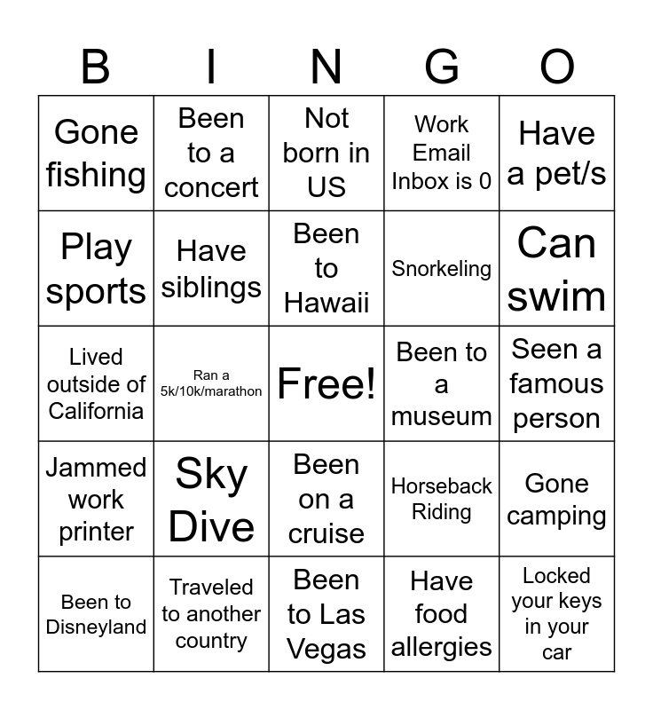 This bingo card has a free space and 24 words: Sky Dive, Traveled to another country, Been to Hawaii, Been to Disneyland, Have a pet/s, Gone fishing, Play sports, Been to a concert, Been to a museum, Been on a cruise, Snorkeling, Lived outside of California, Horseback Riding, Gone camping, Have siblings, Have food allergies, Seen a famous person, Not born in US, Can swim, Ran a 5k/10k/marathon, Locked your keys in your car, Jammed work printer, Work Email Inbox is 0 and Been to Las Vegas.