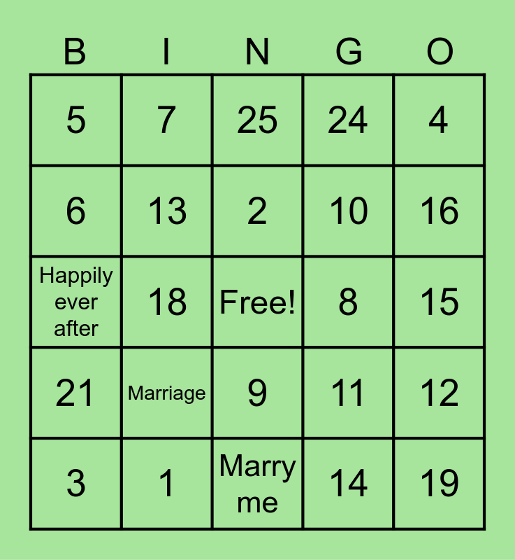 This bingo card has a free space and 24 words: Marriage, 1, 2, 3, 4, 5, 6, 7, 8, 9, 10, Happily ever after, 11, 12, 13, 14, 15, 25, 16, 18, 19, 21, 24 and Marry me.