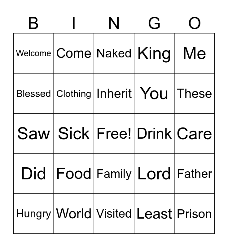This bingo card has a free space and 29 words: Hungry, Thirsty, Sick, Stranger, Welcome, Naked, Clothing, Food, Drink, World, Care, Prison, Visited, Least, These, Members, Family, Did, Me, Saw, Lord, Truly, You, Blessed, King, Come, Father, Inherit and Kingdom.