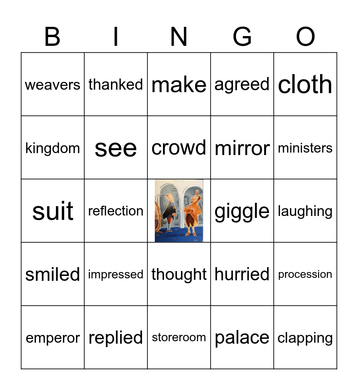 This bingo card has a free space and 29 words: emperor, strut, reflection, clothes, weavers, make, see, impressed, giggle, replied, laughing, clapping, storeroom, palace, ministers, ordered, thought, smiled, cloth, suit, hurried, roared, mirror, kingdom, agreed, thanked, procession, crowd and horse.