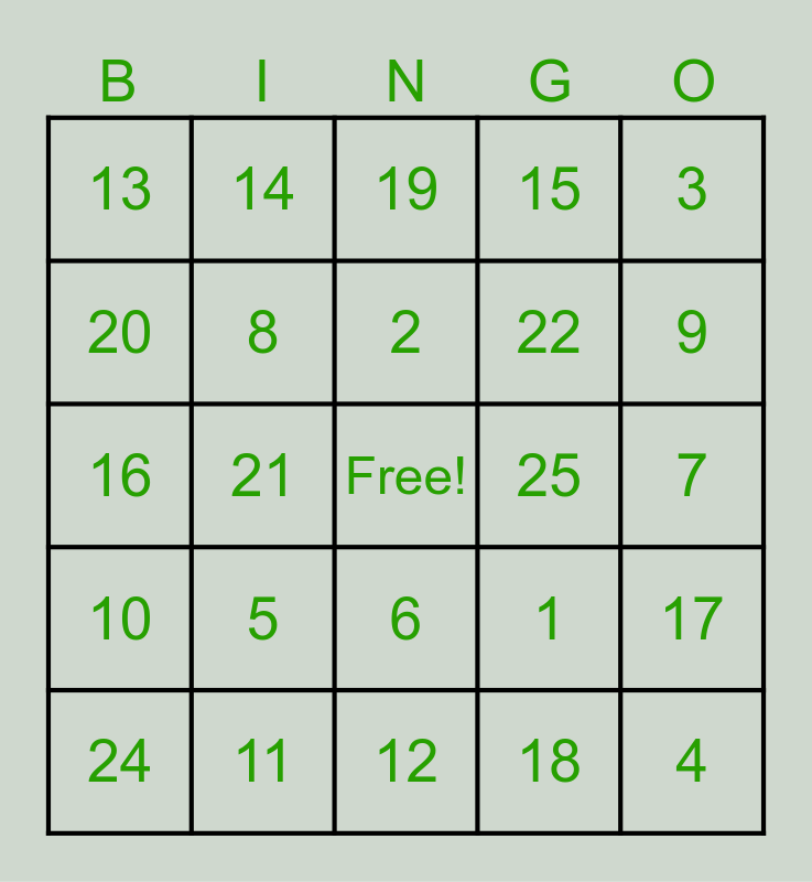 This bingo card has a free space and 24 words: 5, 11, 2, 24, 3, 13, 20, 14, 25, 6, 22, 16, 1, 17, 8, 18, 7, 19, 9, 21, 4, 10, 15 and 12.