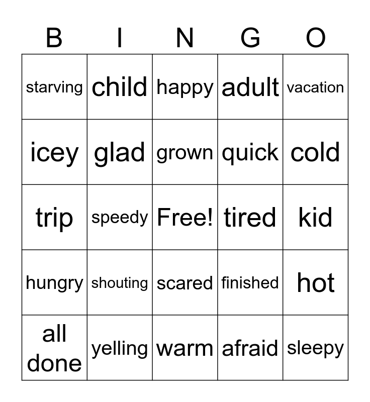 This bingo card has a free space and 24 words: shouting, yelling, grown, all done, vacation, starving, icey, child, tired, scared, quick, trip, finished, hot, glad, afraid, kid, happy, cold, speedy, sleepy, hungry, adult and warm.
