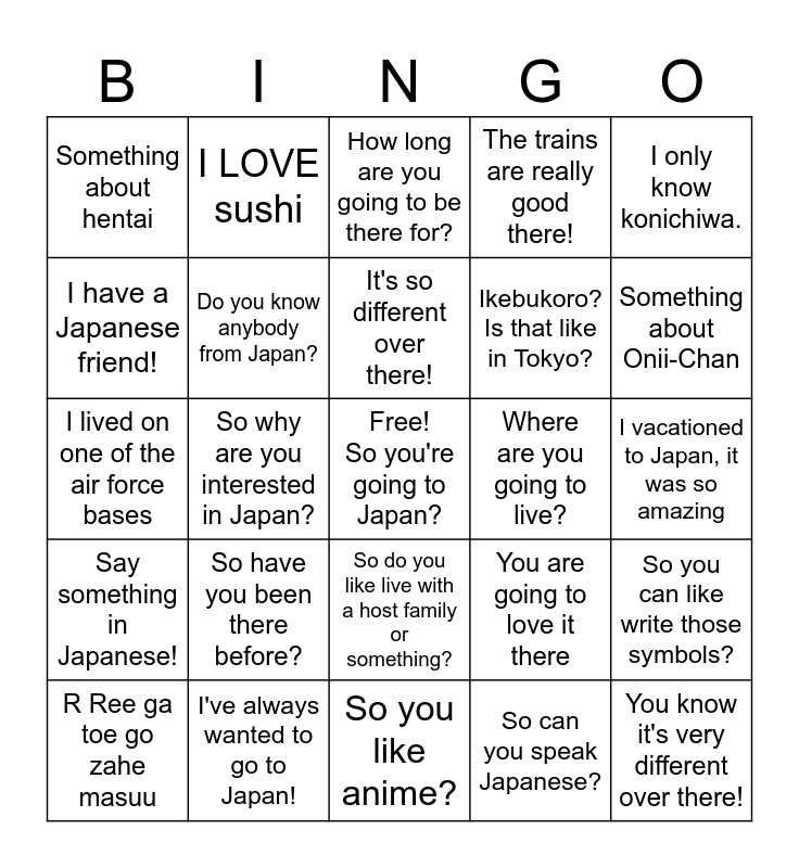 This bingo card has a free space and 24 words: So have you been there before?, I've always wanted to go to Japan!, It's so different over there!, R Ree ga toe go zahe masuu, I only know konichiwa., Something about hentai, I have a Japanese friend!, I LOVE sushi, Where are you going to live?, So do you like live with a host family or something?, Ikebukoro? Is that like in Tokyo?, I lived on one of the air force bases, You are going to love it there, So you can like write those symbols?, Do you know anybody from Japan?, So can you speak Japanese?, I vacationed to Japan, it was so amazing, How long are you going to be there for?, Something about Onii-Chan, So why are you interested in Japan?, You know it's very different over there!, Say something in Japanese!, The trains are really good there! and So you like anime?.