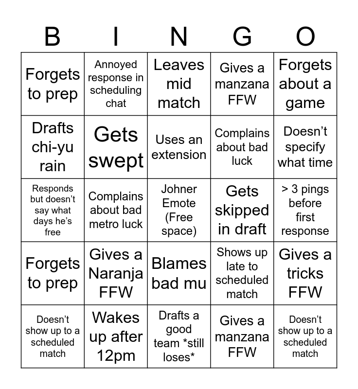 This bingo card has a free space and 24 words: Gives a Naranja FFW, Wakes up after 12pm, Uses an extension, Doesn’t show up to a scheduled match, Forgets about a game, Forgets to prep, Drafts chi-yu rain, Annoyed response in scheduling chat, Gets skipped in draft, Blames bad mu, Complains about bad luck, Responds but doesn’t say what days he’s free, Shows up late to scheduled match, Gives a tricks FFW, Gets swept, Gives a manzana FFW, > 3 pings before first response, Leaves mid match, Doesn’t specify what time, Complains about bad metro luck, Doesn’t show up to a scheduled match, Forgets to prep, Gives a manzana FFW and Drafts a good team *still loses*.