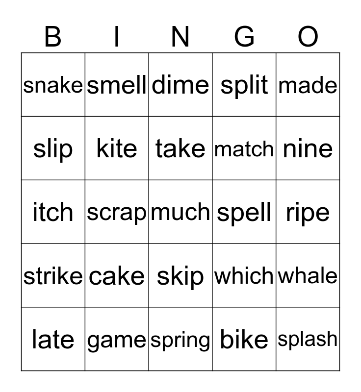 This bingo card has a free space and 24 words: cake, game, take, late, made, snake, slip, smell, spell, skip, match, itch, which, whale, kite, bike, ripe, dime, nine, scrap, splash, strike, split and spring.