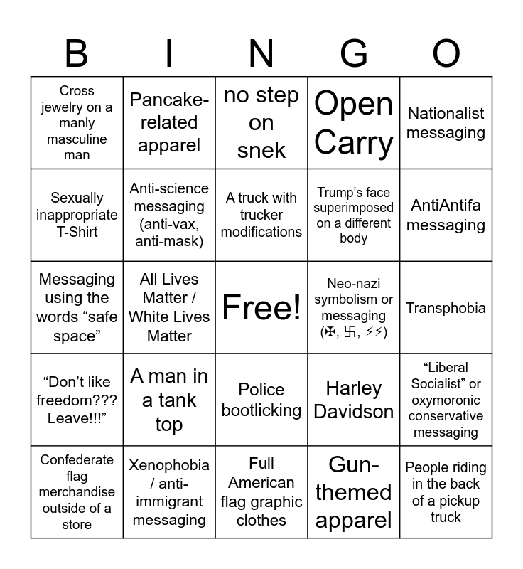 This bingo card has a free space and 25 words: A man in a tank top, Full American flag graphic clothes, A truck with trucker modifications, Confederate flag merchandise outside of a store, Nationalist messaging, Cross jewelry on a manly masculine man, Sexually inappropriate T-Shirt, Pancake-related apparel, Neo-nazi symbolism or messaging (✠, 卐, ⚡︎⚡︎), Police bootlicking, Trump’s face superimposed on a different body, Messaging using the words “safe space”, Harley Davidson, “Liberal Socialist” or oxymoronic conservative messaging, Anti-science messaging (anti-vax, anti-mask), Homophobia, Transphobia, no step on snek, AntiAntifa messaging, All Lives Matter / White Lives Matter, People riding in the back of a pickup truck, Xenophobia / anti-immigrant messaging, “Don’t like freedom??? Leave!!!”, Open Carry and Gun-themed apparel.