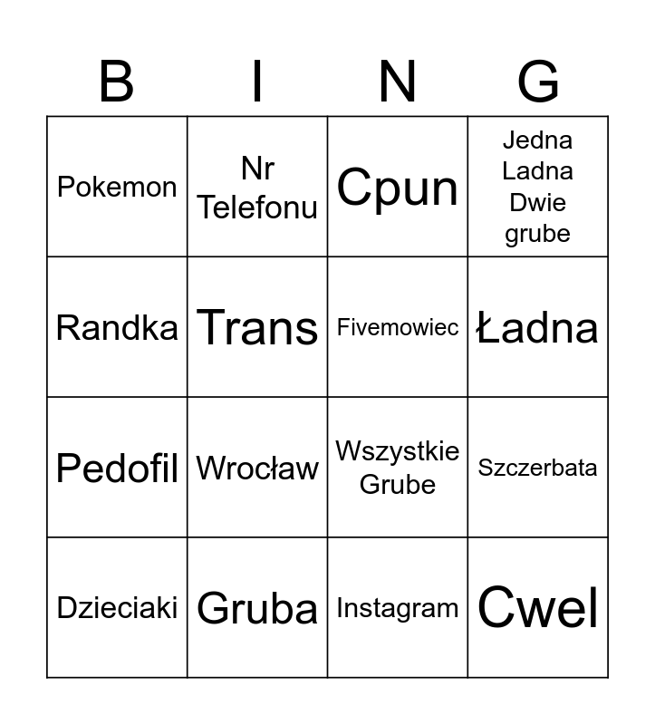 This bingo card has 16 words: Gruba, Szczerbata, Cpun, Pokemon, Pedofil, Nr Telefonu, Wszystkie Grube, Instagram, Randka, Trans, Dzieciaki, Jedna Ladna Dwie grube, Wrocław, Ładna, Fivemowiec and Cwel.