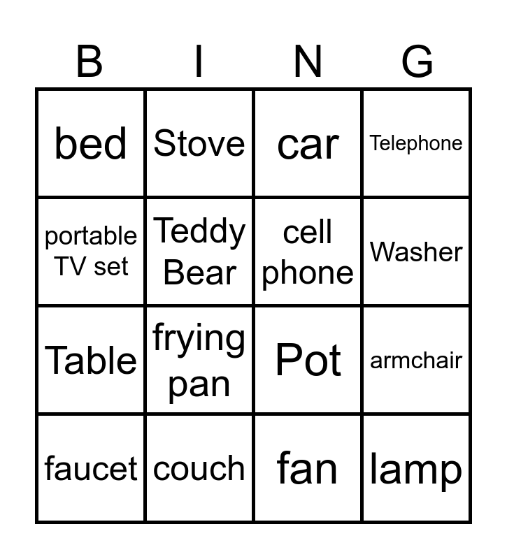 This bingo card has 30 words: Free!, alarm clock, armchair, bathtub, bed, car, cell phone, chair, couch, cup, fan, faucet, flashlight, fridge, frying pan, hair dryer, hanger, lamp, mixer, portable TV set, Pot, Shower}Sink, Stove, Table, Teddy Bear, Telephone, Toilet, Toilet Paper, Washer and Wine Glasses.