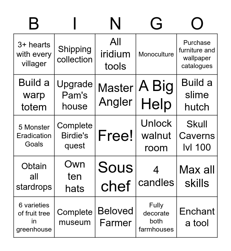This bingo card has a free space and 24 words: Own ten hats, Complete museum, Master Angler, 6 varieties of fruit tree in greenhouse, Purchase furniture and wallpaper catalogues, 3+ hearts with every villager, Build a warp totem, Shipping collection, Unlock walnut room, Sous chef, A Big Help, 5 Monster Eradication Goals, 4 candles, Max all skills, Upgrade Pam's house, Fully decorate both farmhouses, Skull Caverns lvl 100, All iridium tools, Build a slime hutch, Complete Birdie's quest, Enchant a tool, Obtain all stardrops, Monoculture and Beloved Farmer.