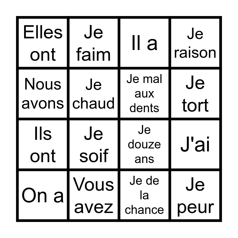 This bingo card has 20 words: J'ai, Tu as, Il a, Elle a, On a, Nous avons, Vous avez, Elles ont, Ils ont, Je faim, Je soif, Je douze ans, Je chaud, Je peur, Je mal aux dents, Je besoin d'aide, Je tort, Je raison, Je de la chance and Je envie de voyager.