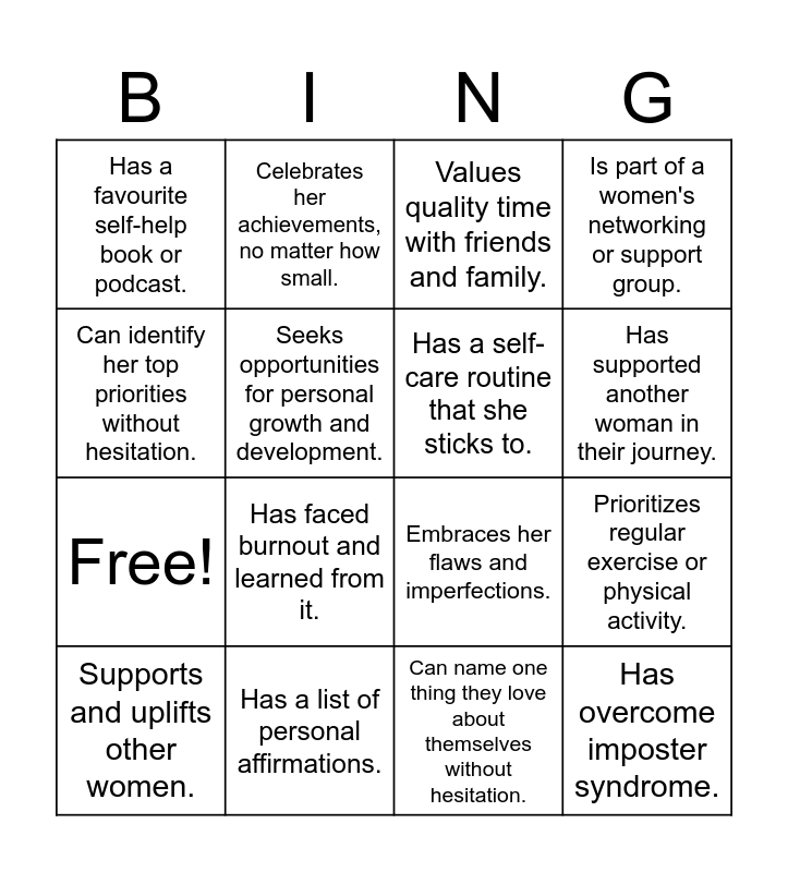 This bingo card has 20 words: Prioritizes regular exercise or physical activity., Successfully juggles multiple roles at work and home., Values quality time with friends and family., Has a female role model or inspiration., Supports and uplifts other women., Can identify her top priorities without hesitation., Has a list of personal affirmations., Has a favourite self-help book or podcast., Free!, Celebrates her achievements, no matter how small., Has faced burnout and learned from it., Embraces her flaws and imperfections., Seeks opportunities for personal growth and development., Has overcome imposter syndrome., Has a self-care routine that she sticks to., Has inspired someone else to embrace their superwoman qualities., Has supported another woman in their journey., Is part of a women's networking or support group., Can name one thing they love about themselves without hesitation. and Has tried a new activity or hobby to challenge themselves..