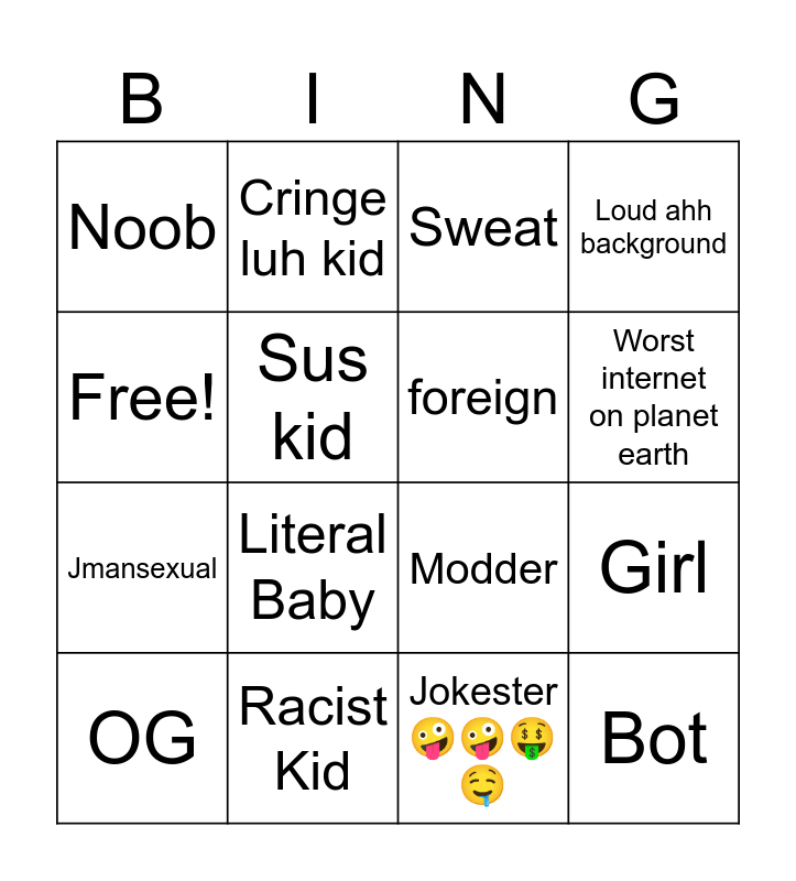 This bingo card has 16 words: Racist Kid, Girl, Sweat, Noob, Jmansexual, Cringe luh kid, Modder, Jokester🤪🤪🤑🤤, Free!, Sus kid, OG, Loud ahh background, Literal Baby, Worst internet on planet earth, foreign and Bot.