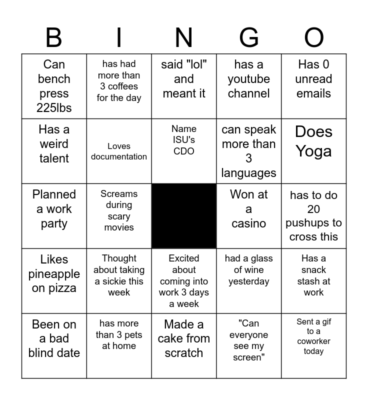 This bingo card has a free space and 24 words: Thought about taking a sickie this week, has more than 3 pets at home, Name ISU's CDO, Been on a bad blind date, Has 0 unread emails, Can bench press 225lbs, Has a weird talent, has had more than 3 coffees for the day, Won at a casino, Excited about coming into work 3 days a week, can speak more than 3 languages, Planned a work party, had a glass of wine yesterday, Has a snack stash at work, Loves documentation, "Can everyone see my screen", has to do 20 pushups to cross this, said "lol" and meant it, Does Yoga, Screams during scary movies, Sent a gif to a coworker today, Likes pineapple on pizza, has a youtube channel and Made a cake from scratch.