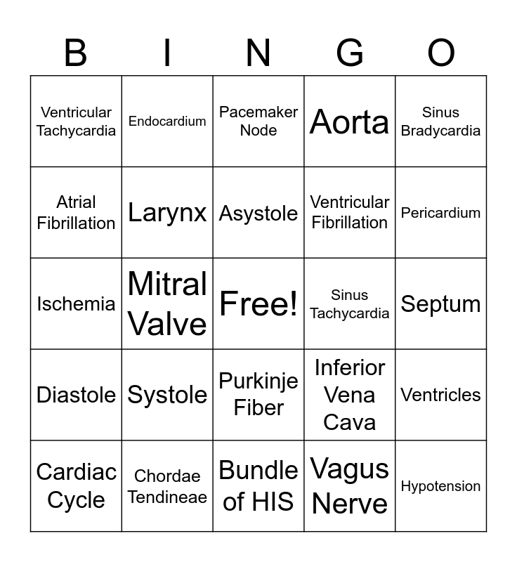 This bingo card has a free space and 24 words: Systole, Chordae Tendineae, Asystole, Cardiac Cycle, Sinus Bradycardia, Ventricular Tachycardia, Atrial Fibrillation, Endocardium, Sinus Tachycardia, Purkinje Fiber, Ventricular Fibrillation, Ischemia, Inferior Vena Cava, Ventricles, Larynx, Vagus Nerve, Septum, Pacemaker Node, Pericardium, Mitral Valve, Hypotension, Diastole, Aorta and Bundle of HIS.