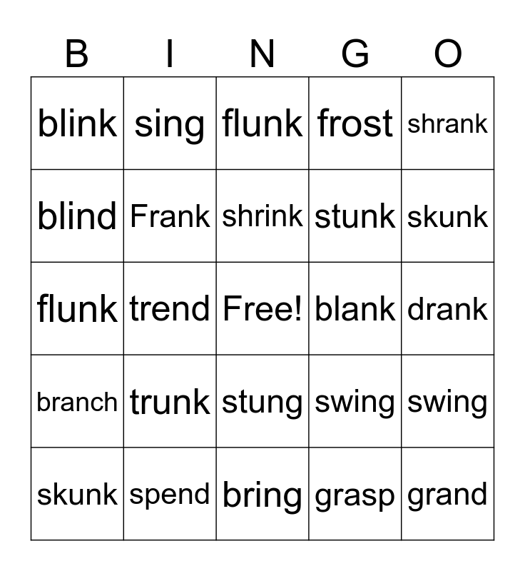 This bingo card has a free space and 25 words: trunk, bring, shrink, skunk, shrank, blink, blind, sing, blank, stung, stunk, flunk, swing, swing, Frank, drink, drank, flunk, skunk, trend, grand, spend, branch, frost and grasp.