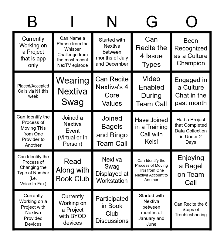 This bingo card has a free space and 24 words: Read Along with Book Club, Currently Working on a Project with BYOD devices, Can Recite Nextiva's 4 Core Values, Currently Working on a Project with Nextiva Provided Devices, Been Recognized as a Culture Champion, Currently Working on a Project that is app only, Placed/Accepted Calls via N1 this week, Can Name a Phrase from the Whisper Challenge from the most recent NexTV episode, Have Joined in a Training Call with Kelsi, Nextiva Swag Displayed at Workstation, Video Enabled During Team Call, Can Identify the Process of Moving TNs from One Provider to Another, Can Identify the Process of Moving TNs from One Nextiva Account to Another, Enjoying a Bagel on Team Call, Wearing Nextiva Swag, Started with Nextiva between months of January and June, Had a Project that Completed Data Collection in Under 2 Days, Started with Nextiva between months of July and December, Engaged in a Culture Chat in the past month, Joined a Nextiva Event (Virtual or In Person), Can Recite the 6 Steps of Troubleshooting, Can Identify the Process of Changing the Type of Number (i.e. Voice to Fax), Can Recite the 4 Issue Types and Participated in Book Club Discussions.