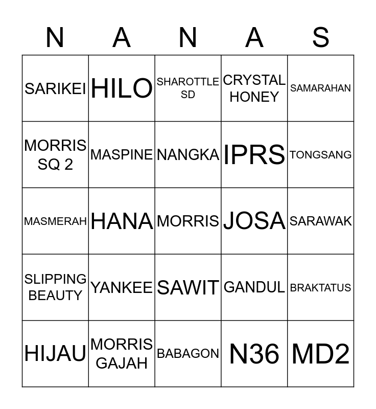 This bingo card has 25 words: YANKEE, BABAGON, NANGKA, HIJAU, SAMARAHAN, SARIKEI, MORRIS SQ 2, HILO, JOSA, SAWIT, IPRS, MASMERAH, GANDUL, BRAKTATUS, MASPINE, MD2, SARAWAK, SHAROTTLE SD, TONGSANG, HANA, MORRIS, MORRIS GAJAH, SLIPPING BEAUTY, CRYSTAL HONEY and N36.