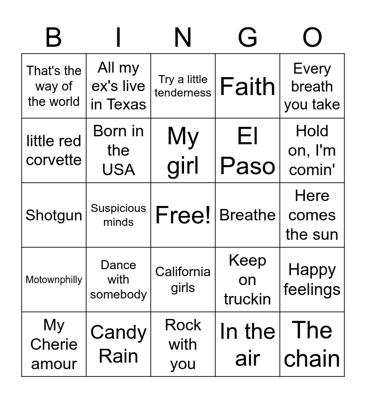 This bingo card has a free space and 24 words: Dance with somebody, Candy Rain, My girl, My Cherie amour, Every breath you take, That's the way of the world, little red corvette, All my ex's live in Texas, Breathe, California girls, El Paso, Shotgun, Keep on truckin, Happy feelings, Born in the USA, In the air, Here comes the sun, Try a little tenderness, Hold on, I'm comin', Suspicious minds, The chain, Motownphilly, Faith and Rock with you.