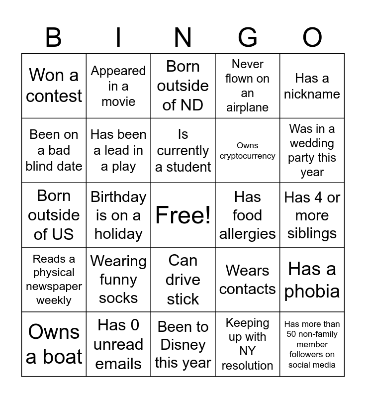 This bingo card has a free space and 49 words: Speaks Another Language, Has more than 50 non-family member followers on social media, Loves true crime podcasts, Been to Disney this year, Wearing funny socks, Won big at a casino, Appeared in a movie, Likes pineapple on pizza, Been on a bad blind date, Participates in a club, Has been a lead in a play, Never flown on an airplane, Has a phobia, Wears contacts, Had Lasik, Has a bff from elementary school, Is currently a student, Has food allergies, Named after a relative, Has a nickname, Birthday is on a holiday, Keeping up with NY resolution, Won a contest, Owns cryptocurrency, Moved in the past year, Was in a wedding party this year, Owns a boat, Notary public, Can drive stick, Reads a physical newspaper weekly, Volunteer firefighter, Brews beer or wine, Drinks 3+ cups of coffee a day, Has a work playlist, Has 0 unread emails, Buys coffee daily, Works out before work, Only child, Has 4 or more siblings, Read 10+ books this year, Has an exotic pet, Uses a paper planner, Creates art, Parents born outside of US, Born outside of US, Born outside of ND, Has officiated a wedding, Has a tattoo and Been scuba diving.