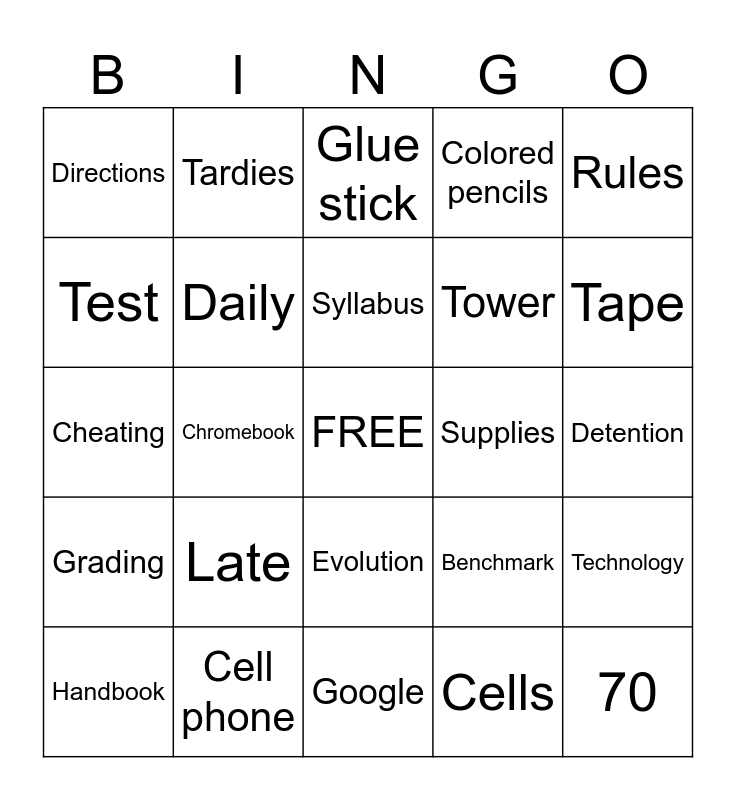 This bingo card has a free space and 36 words: Book, Email, Labs, Daily, Benchmark, Grading, Syllabus, Respect, Rules, Standards, Chromebook, Colored pencils, Notebook, Supplies, Tape, Directions, Prepared, Late, 70, Glue stick, Detention, Technology, Cell phone, Handbook, Google, Tardies, Cheating, Number, Tower, Test, 30, Milestone, Cells, Evolution, 10 and biology.