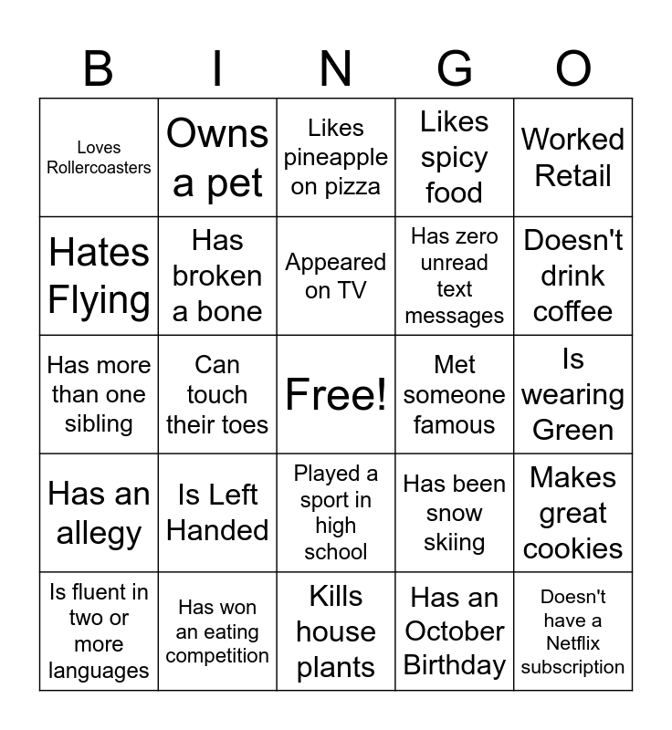 This bingo card has a free space and 24 words: Is Left Handed, Has won an eating competition, Appeared on TV, Is fluent in two or more languages, Worked Retail, Loves Rollercoasters, Hates Flying, Owns a pet, Met someone famous, Played a sport in high school, Has zero unread text messages, Has more than one sibling, Has been snow skiing, Makes great cookies, Has broken a bone, Has an October Birthday, Is wearing Green, Likes pineapple on pizza, Doesn't drink coffee, Can touch their toes, Doesn't have a Netflix subscription, Has an allegy, Likes spicy food and Kills house plants.