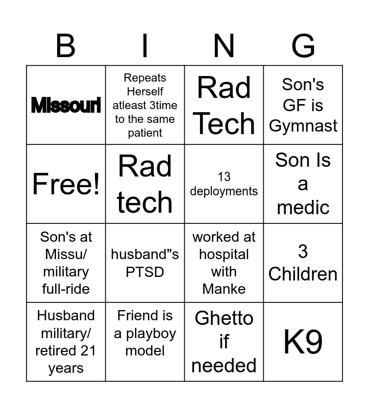 This bingo card has 16 words: Friend is a playboy model, 3 Children, Rad Tech, Missouri, Son's at Missu/ military full-ride, Repeats Herself atleast 3time to the same patient, worked at hospital with Manke, Ghetto if needed, Free!, Rad tech, Husband military/ retired 21 years, Son's GF is Gymnast, husband"s PTSD, Son Is a medic, 13 deployments and K9.
